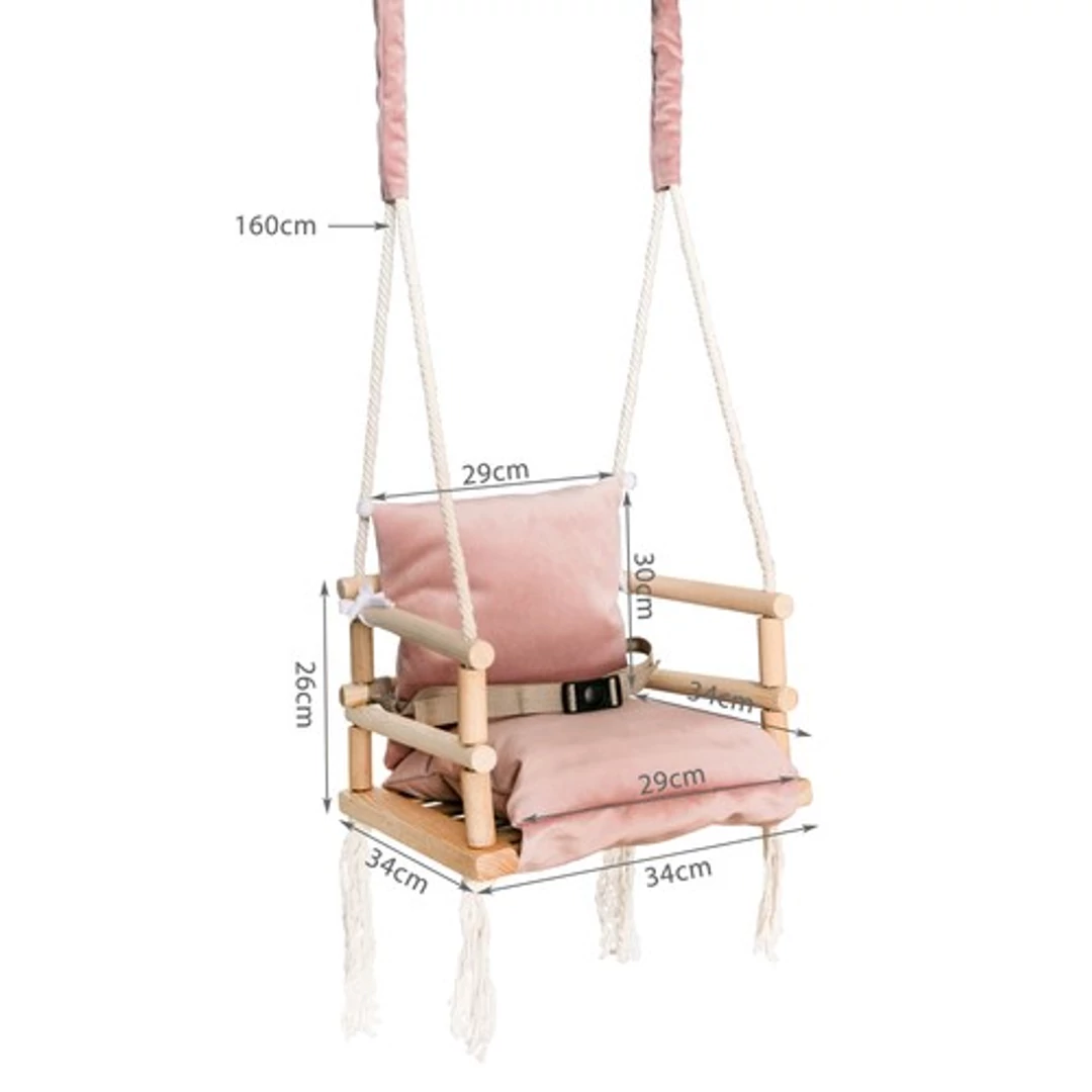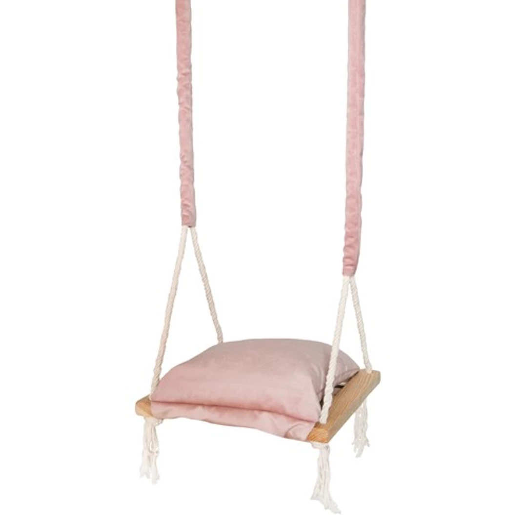 A párna és a hintaállvány finom, bársonyos-plüss Cleanaboo anyagból készült. Ez az anyag nem szívja fel a vizet, a kiömlött folyadék cseppekké képződik, ami nagy előny a gyermek számára. A hinta minden apró részletre odafigyelve készült. Alkalmas 8 hónapos kortól (a gyermek maximális súlya 30 kg). Anyaga puha, kellemes tapintású. Teljesen biztonságos a gyermek számára, a szélei lekerekítettek és az egész precízen polírozott. Lehetőség van a hinta anyagrészeinek eltávolítására, így könnyedén gondoskodhat a higiéniájáról.