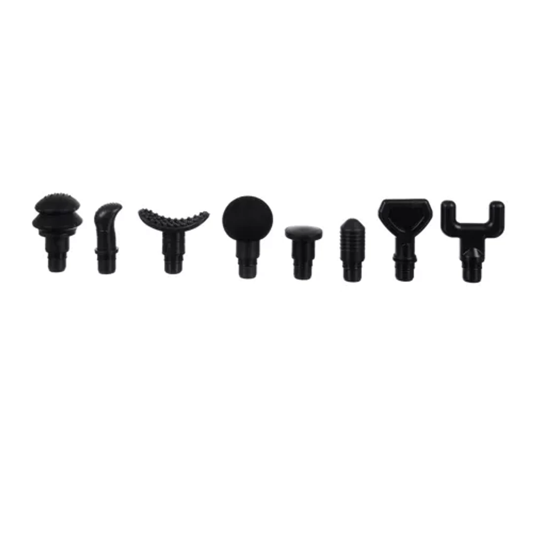 - 8 CSERÉLHETŐ MASSZÁZS FEJ - minden izomcsoportnak megfelelő ingerekre van szüksége, és a 8 különböző masszázsfejnek köszönhetően sok izmot lehet dolgoztatni, még a nehezen hozzáférhető helyeken is. A készlet olyan fejeket tartalmaz, mint például: kerek, lapos, golyó és villa – ezek használatának részletes leírása lent a leírásban található. A pisztoly a legjobb minőségű anyagokból készült, tökéletesen illeszkedik a kézbe, a fogás helyét pedig csúszásgátló szerkezet borítja, amely megakadályozza, hogy a masszázs során kicsússzon a kezéből.