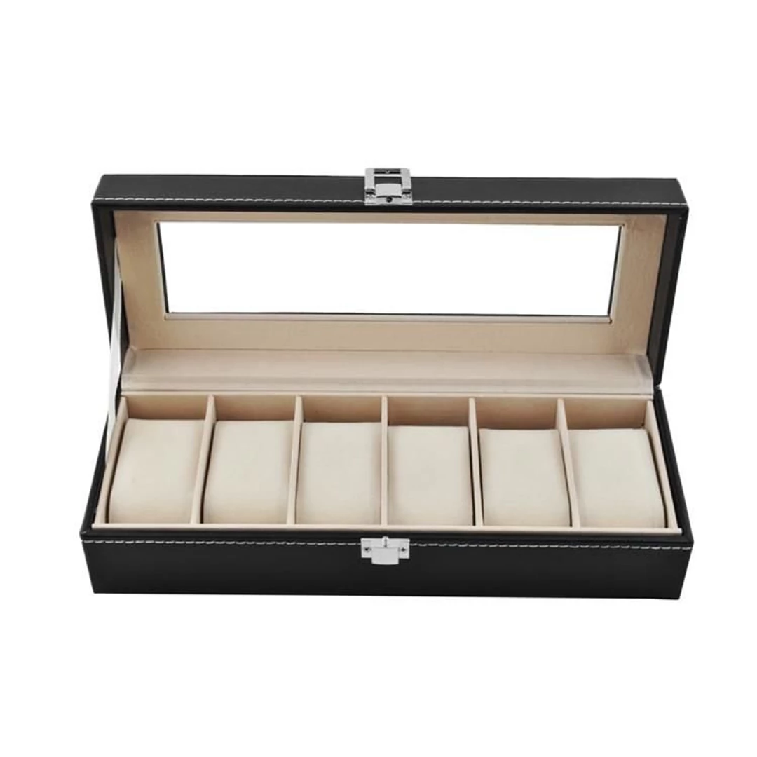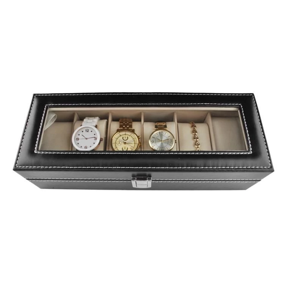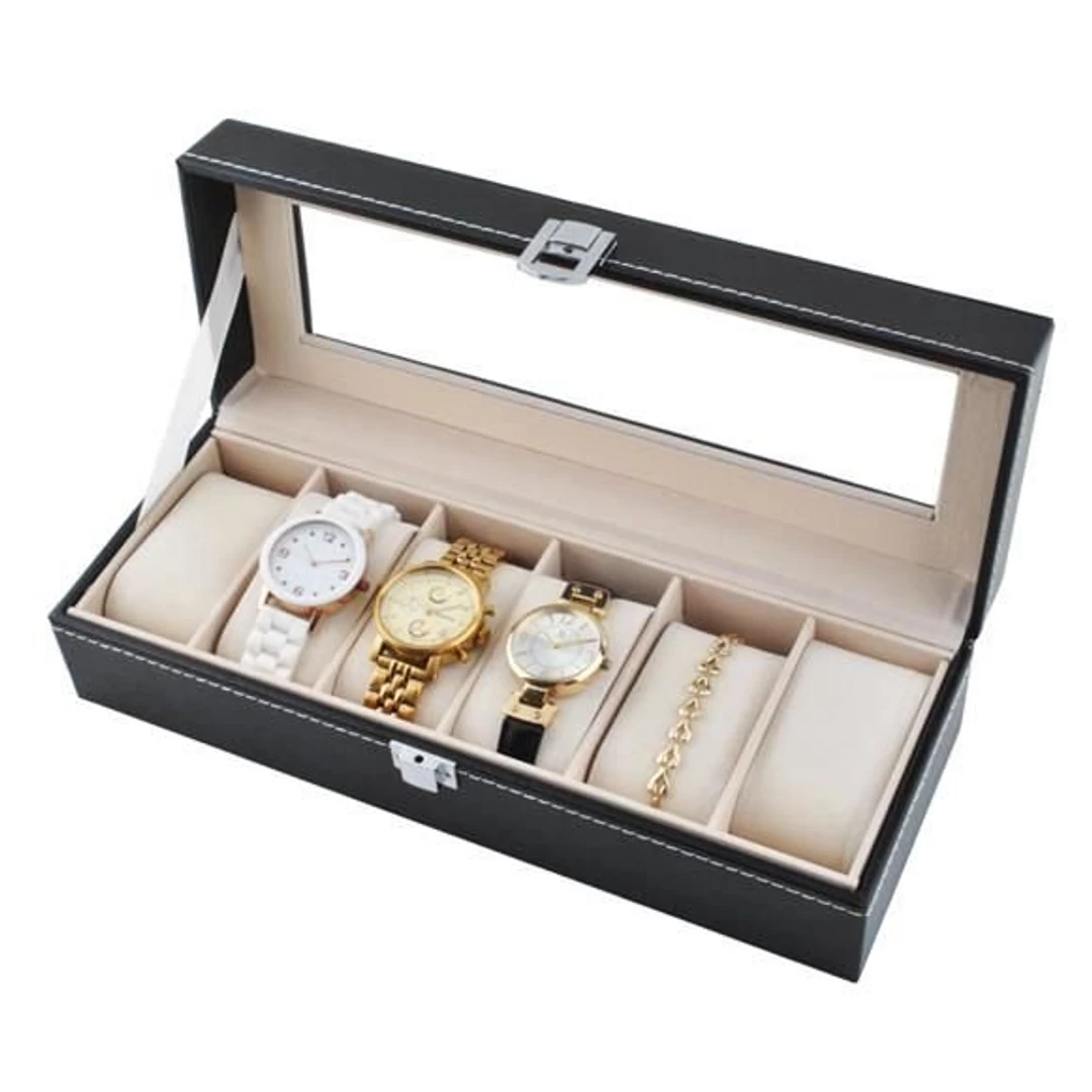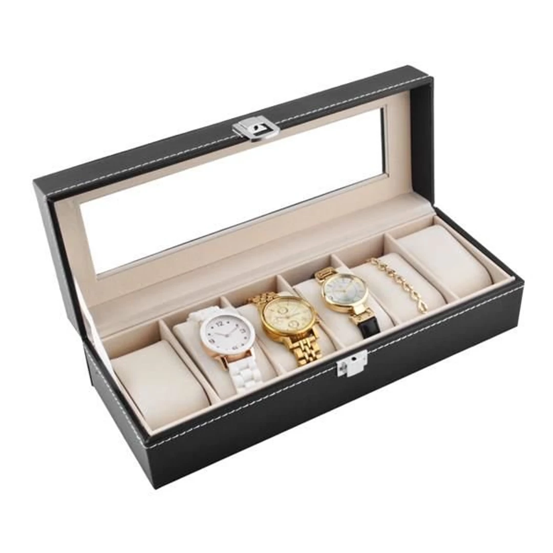 Az elegáns doboz 6 résszel rendelkezik, amelyekbe órákat és ékszereket is elhelyezhet. A tok elegáns, fekete színű, a varratok világosabb árnyalataival még stílusosabbá teszi az egészet. Az óra dobozának fedele átlátszó (akrilüveg), amely lehetővé teszi a tok használatát nemcsak tároláshoz, hanem a tartalom megjelenítéséhez is. Óra doboz vásárlásával csodálatos ajándék lehet, amelyet mindenki nagyra értékel.