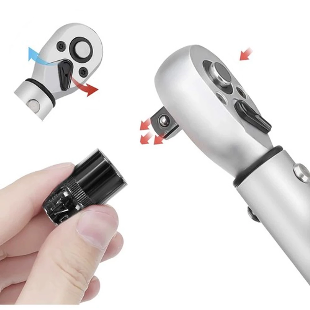 A több racsnis kulcs négyszögletes, hatlapú, motorkerékpár anyákhoz és horgokhoz is használható. A forgó kialakításnak köszönhetően a szerszám használata kényelmesebb.17/19/21 mm-es rátétet tartalmaz a készlet, ezenkívül van egy vízszintes hosszabbító is, melyek megkönnyítik a munkát. A nyomaték egyszerű beállítása lehetővé teszi a kulcs pontos használatát. Zárja le a kupakot a „LOCK” irányba, és engedje el az „UNLOCK” zárat. A készlet nem csak egy racsnis többfunkciós kulcsot tartalmaz, hanem egy kényelmes tokot is, aminek köszönhetően a szerszám jól védett lesz használaton kívül is.